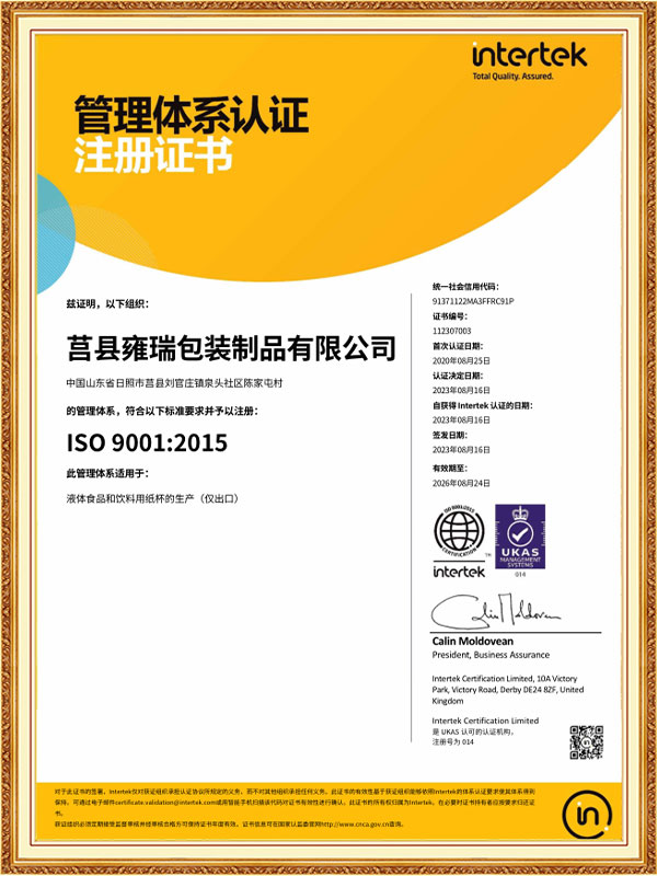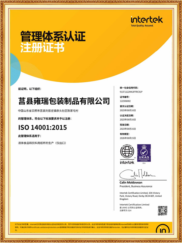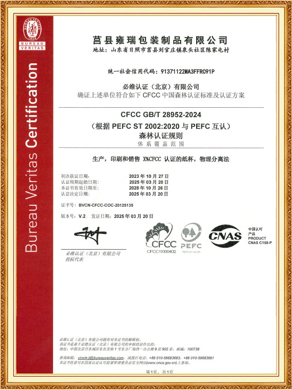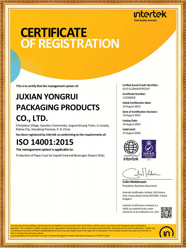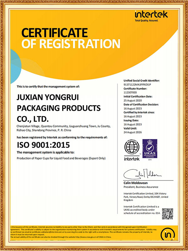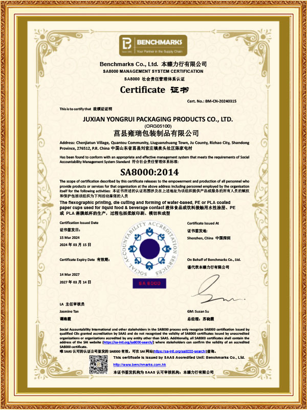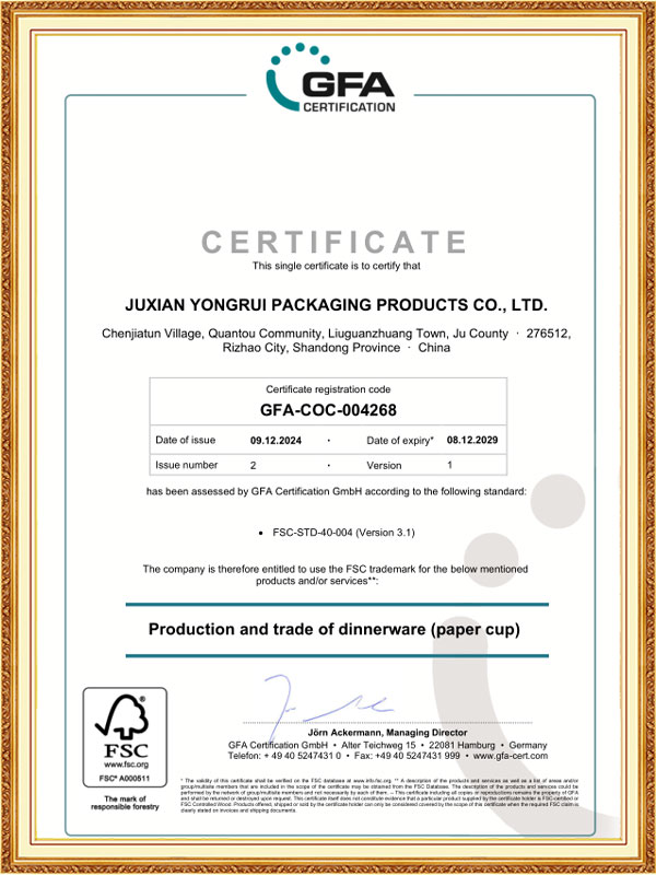 لتلبية المعايير الدولية الصارمة، تحمل منتجاتنا شهادات تشمل ISO 9001، ISO 14001، FSC، BRC، وDIN إلخ. علاوة على ذلك، تطور Yongrui Packaging بنشاط أكوابًا ورقية مصنوعة من مواد خام FSC وEUDR، وتقود بحزم وثبات صناعة التغليف نحو التنمية المستدامة. نقدم خدمة "شاملة" كاملة، من التصميم إلى ما بعد البيع، فرقنا جاهزة للمساعدة على مدار الساعة. في الوقت نفسه، خدمة OEM & ODM متاحة لمساعدتك في بناء علامتك التجارية.